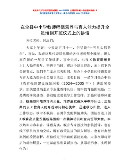 / 在全县中小学教师师德素养与育人能力提升全员培训开班仪式上的讲话