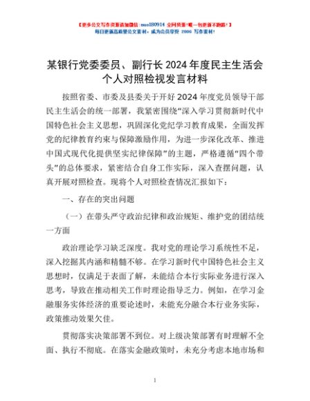 / 某银行党委委员、副行长2024年度民主生活会个人对照检视发言材料