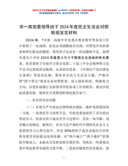 / 市一高党委领导班子2024年度民主生活会对照检视发言材料