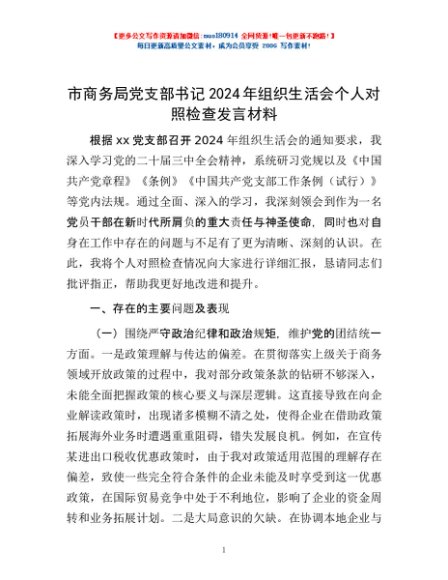 / 市商务局党支部书记2024年组织生活会个人对照检查发言材料