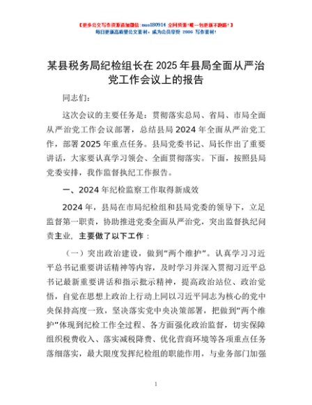 / 某县税务局纪检组长在2025年县局全面从严治党工作会议上的报告