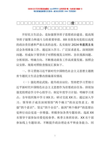 / 某市商务局党组关于2024年度民主生活会领导班子对照检视剖析材料
