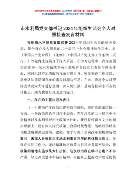/ 市水利局党支部书记2024年组织生活会个人对照检查发言材料