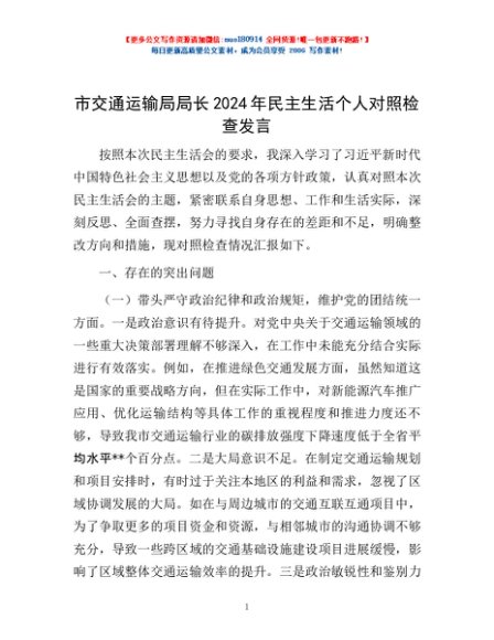 / 市交通运输局局长2024年民主生活个人对照检查发言