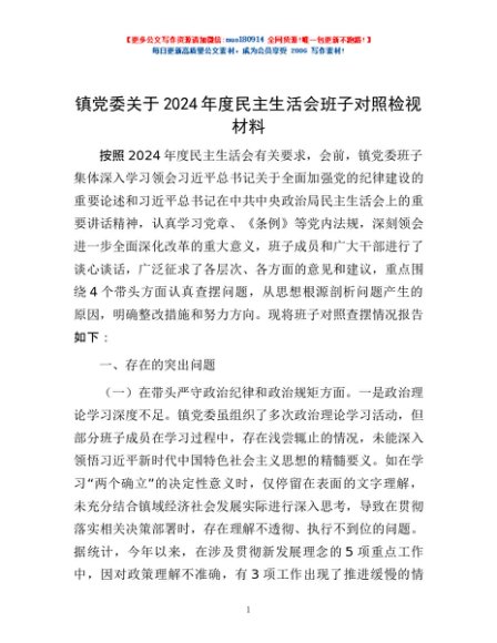/ 镇党委关于2024年度民主生活会班子对照检视材料