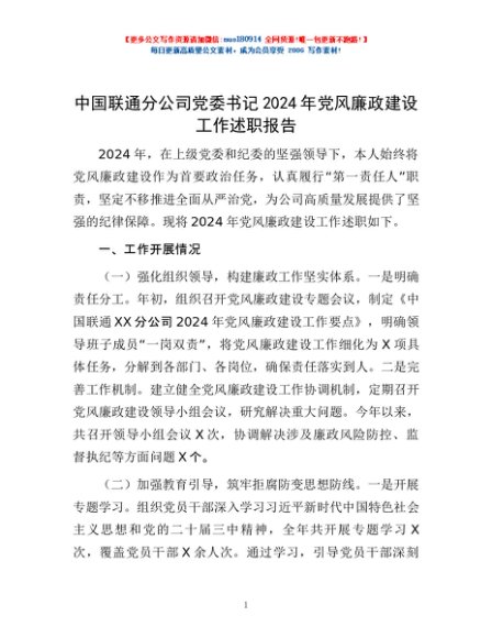/ 中国联通分公司党委书记2024年党风廉政建设工作述职报告