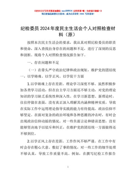 / 纪检委员2024年度民主生活会个人对照检查材料(原)