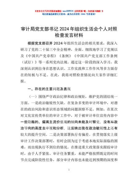 / 审计局党支部书记2024年组织生活会个人对照检查发言材料