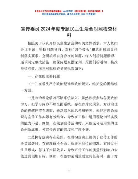 / 宣传委员2024年度专题民主生活会对照检查材料