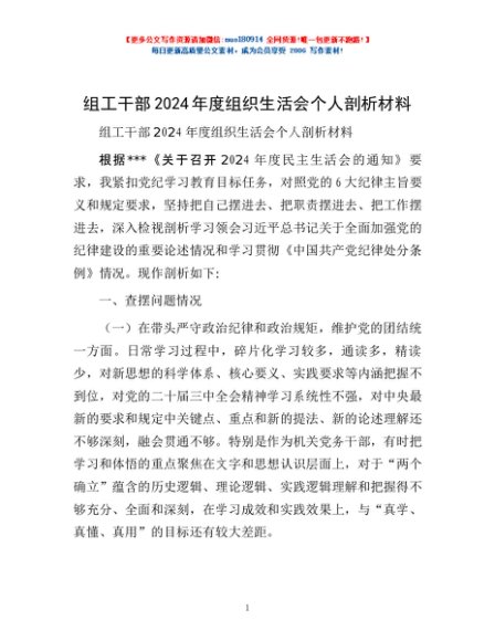 / 组工干部2024年度组织生活会个人剖析材料