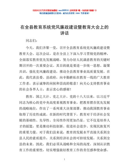 / 在全县教育系统党风廉政建设暨教育大会上的讲话