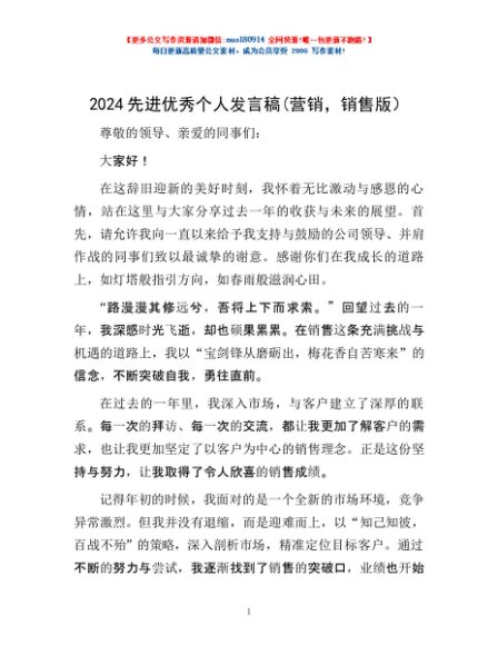 / 2024先进优秀个人发言稿(营销,销售版)
