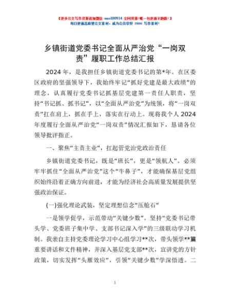/ 乡镇街道党委书记全面从严治党“一岗双责”履职工作总结汇报