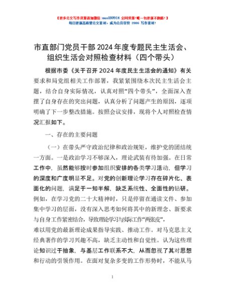 / 市直部门党员干部2024年度专题民主生活会、组织生活会对照检查材料(四个带头)