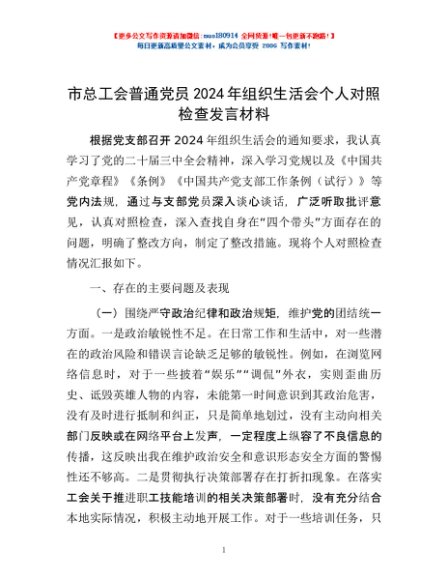 / 市总工会普通党员2024年组织生活会个人对照检查发言材料