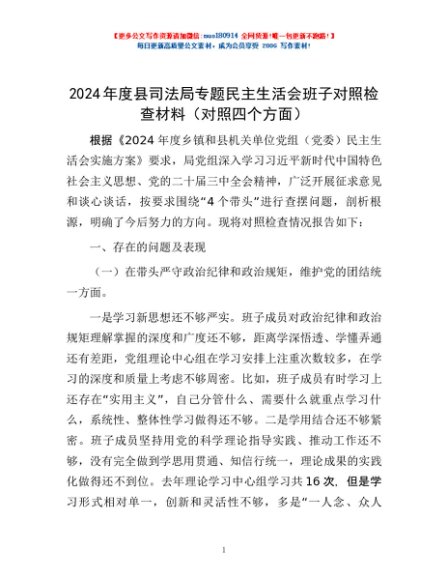 / 2024年度县司法局专题民主生活会班子对照检查材料(对照四个方面)