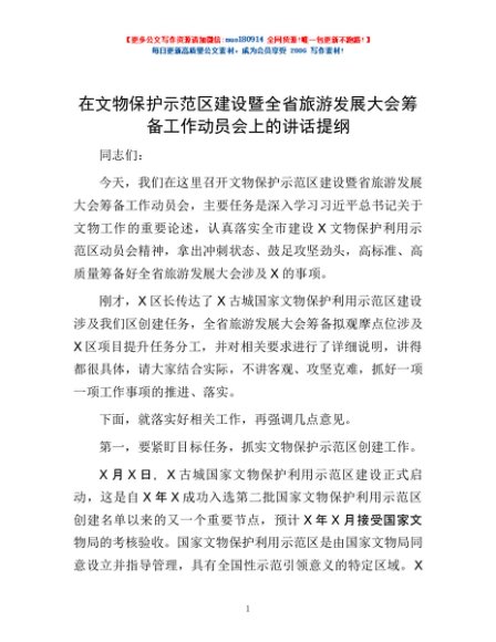 / 在文物保护示范区建设暨全省旅游发展大会筹备工作动员会上的讲话提纲