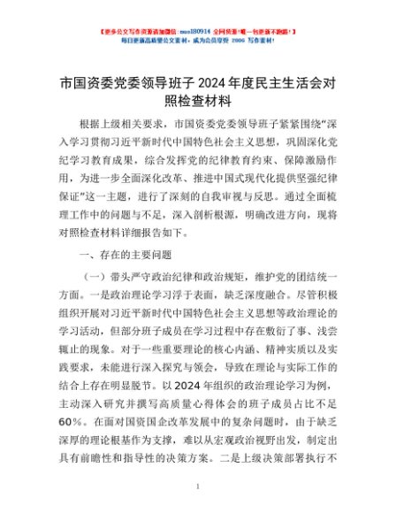 / 市国资委党委领导班子2024年度民主生活会对照检查材料