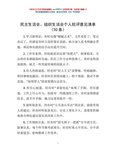 / 民主生活会、组织生活会个人批评意见清单(50条)