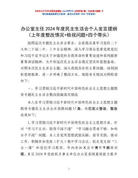 / 办公室主任2024年度民主生活会个人发言提纲(上年度整改情况+检视问题+四个带头)