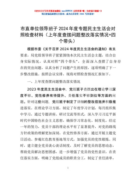/ 市直单位领导班子2024年度专题民主生活会对照检查材料(上年度查摆问题整改落实情况+四个带头)
