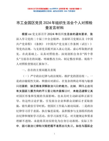 / 市工业园区党员2024年组织生活会个人对照检查发言材料