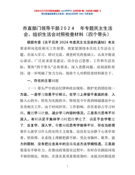 / 市直部门领导干部2024年专题民主生活会、组织生活会对照检查材料(四个带头)