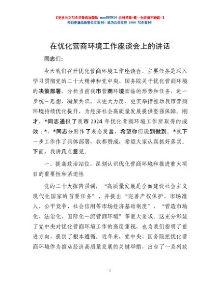 / 在优化营商环境工作座谈会上的讲话