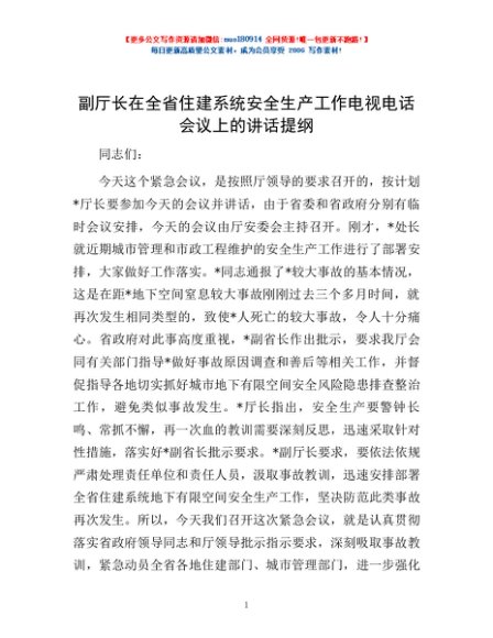 / 副厅长在全省住建系统安全生产工作电视电话会议上的讲话提纲