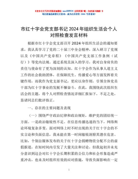 / 市红十字会党支部书记2024年组织生活会个人对照检查发言材料