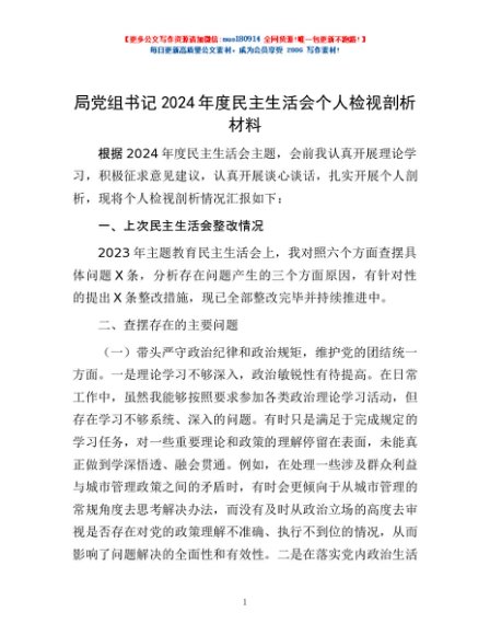/ 局党组书记2024年度民主生活会个人检视剖析材料