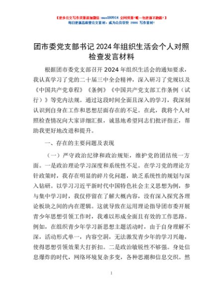 / 团市委党支部书记2024年组织生活会个人对照检查发言材料
