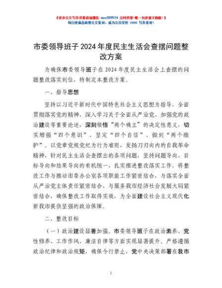 / 市委领导班子2024年度民主生活会查摆问题整改方案