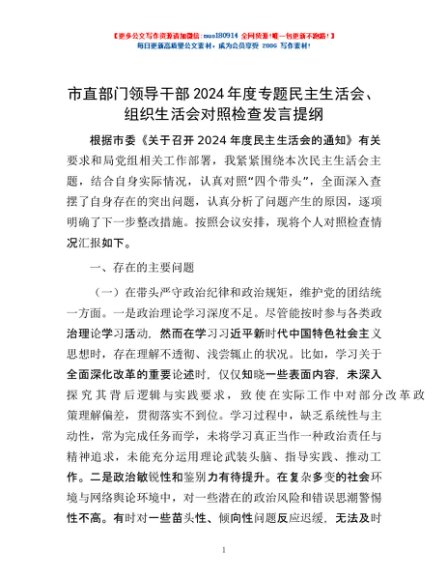 / 市直部门领导干部2024年度专题民主生活会、组织生活会对照检查发言提纲