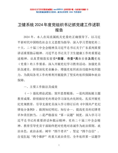/ 卫健系统2024年度党组织书记抓党建工作述职报告