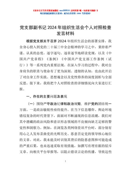 / 党支部副书记2024年组织生活会个人对照检查发言材料