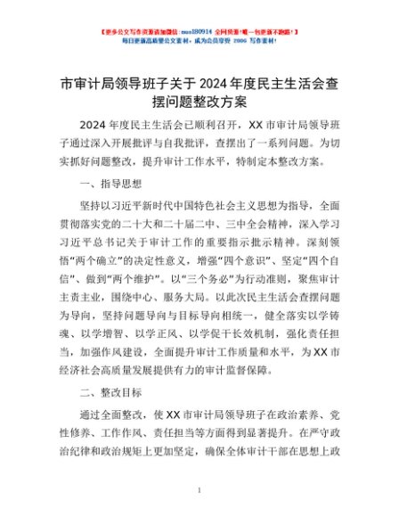 / 市审计局领导班子关于2024年度民主生活会查摆问题整改方案_002