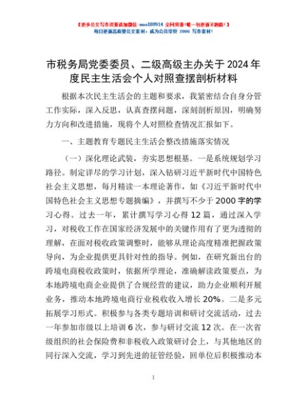 / 市税务局党委委员、二级高级主办关于2024年度民主生活会个人对照查摆剖析材料