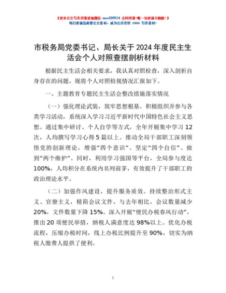 / 市税务局党委书记、局长关于2024年度民主生活会个人对照查摆剖析材料