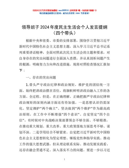 / 领导班子2024年度民主生活会个人发言提纲(四个带头)