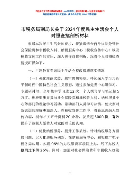 / 市税务局副局长关于2024年度民主生活会个人对照查摆剖析材料