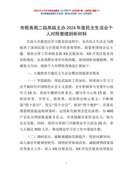 / 市税务局二级高级主办2024年度民主生活会个人对照查摆剖析材料