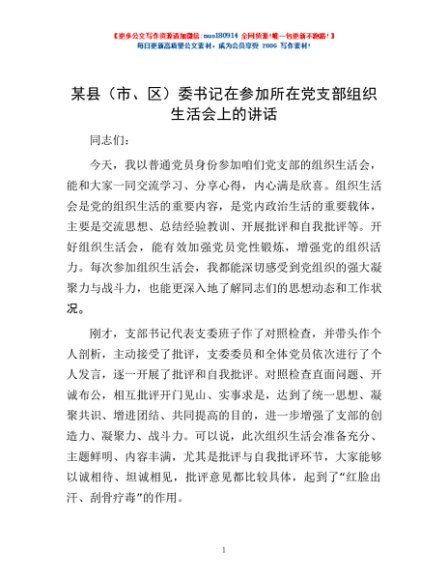 / 某县(市、区)委书记在参加所在党支部组织生活会上的讲话