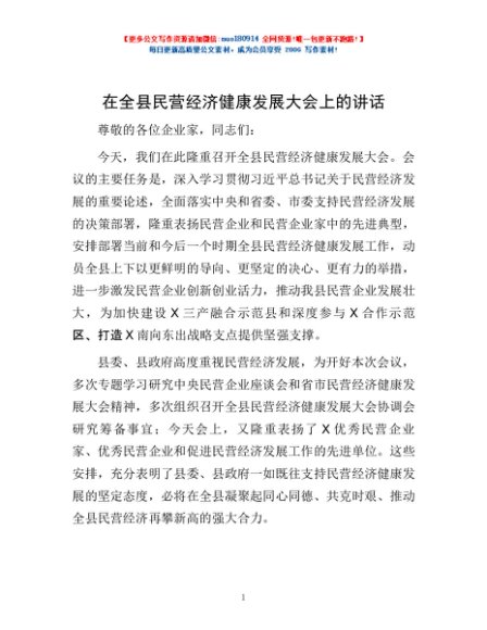 / 在全县民营经济健康发展大会上的讲话