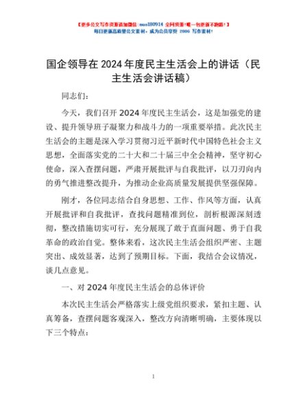/ 国企领导在2024年度民主生活会上的讲话(民主生活会讲话稿)