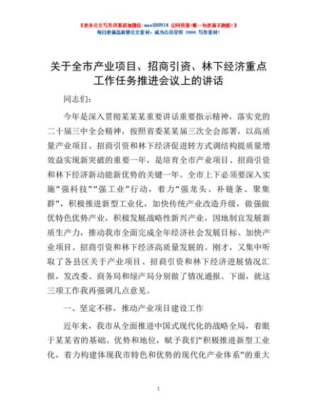 / 关于全市产业项目、招商引资、林下经济重点工作任务推进会议上的讲话
