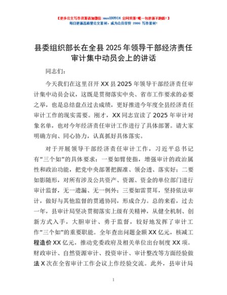 / 县委组织部长在全县2025年领导干部经济责任审计集中动员会上的讲话