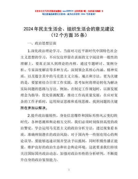 / 2024年民主生活会、组织生活会的意见建议(12个方面35条)