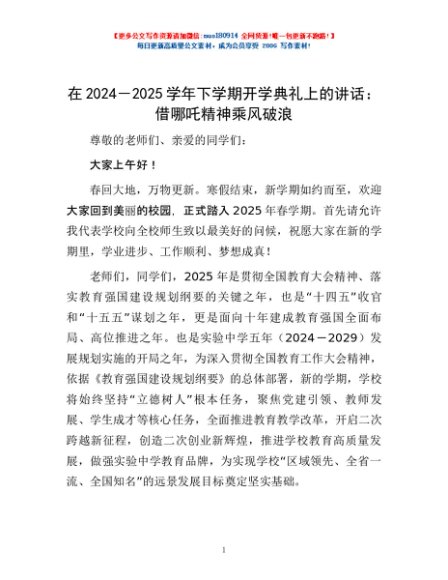 / 在2024-2025学年下学期开学典礼上的讲话:借哪吒精神乘风破浪