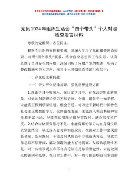 / 党员2024年组织生活会“四个带头”个人对照检查发言材料